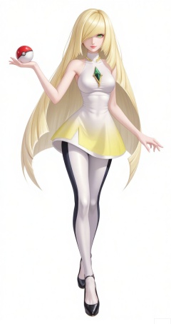 1girl, lusamine \(pokemon\), long hair, poke ball, solo, blonde hair, hair over one eye,holding poke ball, green eyes, very long hair, holding, full body, leggings, dress, smile, white background, sleeveless, short dress, sleeveless dress, high heels, green gemstone, simple background, breasts, diamond \(shape\), standing, bare arms, poke ball \(basic\), bare shoulders, gem,11