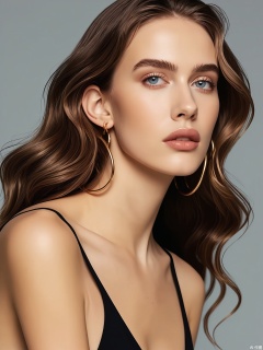 CMRX, A photograph of a woman with long, wavy brown hair, styled in loose curls. She has fair skin, blue eyes, and is wearing subtle makeup with a natural look. Her lips are a soft pink, and she is wearing small gold hoop earrings. She is dressed in a black spaghetti-strap top, revealing her shoulders. The background is a plain, light gray, and the lighting is soft and even, highlighting her features. The image has a clean, professional aesthetic.