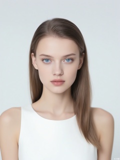 CMRX, Photo of a young woman with light skin, long straight brown hair, and striking blue eyes. She has a neutral expression and is looking directly at the camera. She is wearing a white top with a subtle, elegant design. The background is a simple, clean white. Soft, even lighting. The image has a professional, high-quality feel. The woman has a slender build and delicate features.