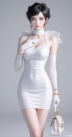 1girl, solo, jewelry, earrings, dress, short hair, black hair, gloves, elbow gloves, white dress, bracelet, handbag, makeup, white gloves, bag, blue eyes, scarf, ring, hand on own chest, grey background, lipstick, bare shoulders, breasts,8