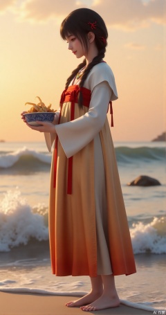 The girl in a modified Hanfu in a white orange apron stands barefoot on the beach, with red coral hairpins on her double braids dancing with the waves. The sunset dyed the sea surface amber. She held a blue and white porcelain bowl in her hand and held a fresh catch. She used the three-point composition method to capture the silhouettes of waves and reefs. The f/1.8 large aperture blurred background highlights the side face of the character, --ar 16:9 --v 6"