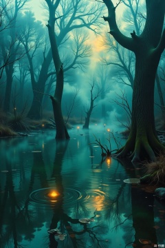 In a fog-shrouded swamp, decaying tree trunks half-submerge in dark green water, with eerie will-o'-the-wisps flickering. The exaggerated color contrasts of Post-Impressionism emphasize the eerie atmosphere. Cinematic diffused light filters through the thick fog, and dark rendering deepens the sense of dread. The cool color palette and rule of thirds composition showcase a mysterious and unpredictable fantasy swamp..,surrealism,motion blur effect,cinematic texture background,vivid color
