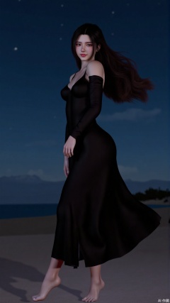 3D, high resolution, sharpness enhancement, extremely high resolution, 4k, added details, detail enhancement, sweet girl, (((full body))), ((long hair)), petite figure, ((slim waist)), facing the camera, slightly sideways, tilting head, cute smile, elegant black long dress, no shoes, barefoot, night, starry sky, beach, sea breeze, flowing hair,