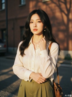 She wears a vintage-inspired outfit: a cream-colored button-down blouse with lace trim, tucked into a high-waisted midi skirt in soft olive green. Her look is completed with small pearl earrings, a brown leather shoulder bag, and classic oxford shoes. Her pose is relaxed, with one hand gently touching her collarbone, the other loosely resting on the strap of her bag. Wind lifts a few strands of her hair, adding a touch of movement.