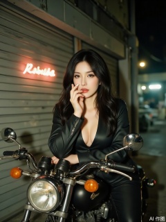 a stunning black-haired woman with a perfect hourglass figure, leaning confidently on a vintage motorcycle, wearing a tight black leather jacket with a deep V-neck showing subtle cleavage, long wavy black hair cascading over her shoulders, bold makeup with deep red lipstick and smoky eyes, holding a cigarette between her fingers with a seductive gaze, dimly lit urban alley at night, metal garage door background with gritty textures, dramatic shadows and reflections from neon lighting, cinematic angle, realistic photography style, high detail, 85mm lens, shallow depth of field, bokeh lights in the background, high contrast, moody atmosphere