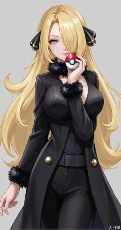 1girl, cynthia \(pokemon\), breasts, blonde hair, solo, long hair, holding poke ball, holding, poke ball, cleavage, black pants, hair over one eye, hair ornament, pants, poke ball \(basic\), fur trim, fur collar, grey eyes, coat, closed mouth, grey background, looking at viewer, long sleeves, black coat, large breasts, very long hair, shirt, black shirt, eyelashes, fur-trimmed coat, hand up, simple background,4