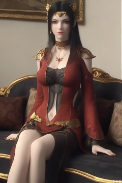 score_9_up,1girl, solo, long hair, breasts, looking at viewer, blue eyes, black hair, dress, jewelry, earrings, pointy ears, necklace, clothing cutout, red dress/black lace,navel cutout,MDS,indoor,sitting on the couch,