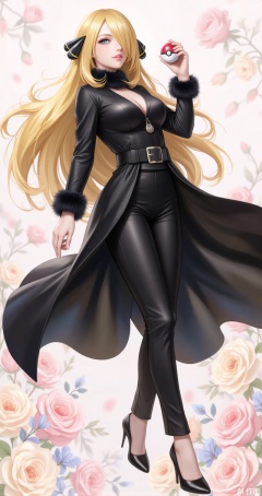 1girl, cynthia \(pokemon\), long hair, blonde hair, solo, poke ball, breasts, holding poke ball, hair ornament, poke ball \(basic\), holding, high heels, hair over one eye, floating hair, very long hair, pants, fur trim, black pants, coat, flower background, flowers,grey eyes, medium breasts, simple background, full body, fur collar, black coat,7