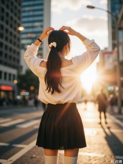 Create a film-style photo of a beautiful woman with black hair styled in a long ponytail with a white ribbon. She wears an off-shoulder white blouse paired with a black pleated skirt and white knee-high socks. Her back is to the camera, standing on a city street during sunset. The warm golden hour light casts long shadows and creates a lens flare effect. She holds her hair up with her hands, and there are subtle particles floating in the air. The background features a bustling urban scene with tall buildings, streetlights, and a few visible pedestrians. The atmosphere is serene yet vibrant, capturing the transition from day to night.