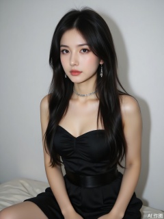 A captivating portrait of a young woman with striking features. She sits alone, her long, raven-black hair cascading down her back like a waterfall of night. Her piercing black eyes meet the viewer's gaze, her full lips painted a subtle shade of pink. A simple yet elegant dress adorns her upper body, its curves accentuated by the soft lighting. A delicate choker and dangling earrings add a touch of sophistication to her overall appearance, as she presents herself with confidence and poise against a minimalist background.