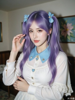 Create a film-style photo of a beautiful woman with a perfect figure. She has long purple hair styled in twin tails with blue ribbons. Wearing a white dress with blue heart-shaped accessories, a blue collar with heart charms, and a white frilly cape. She makes a playful gesture with her hand near her face. The background is simple and indoor with soft lighting that highlights her features and the textures of her clothing. The atmosphere is whimsical yet elegant.