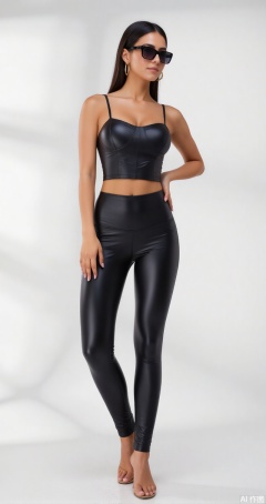 1girl, solo, jewelry, sunglasses, hoop earrings, earrings, long hair, pants, contrapposto, full body, hand on own hip, realistic, crop top, black hair, standing, midriff, black pants, lips, breasts, sandals, bare shoulders, fashion,3