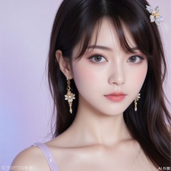 baoshi,lvjing,xiaomei,pifu,black hair,long hair,grey eyes,fair_skin,earrings,jewelry,1girl,solo,pantyhose,brown hair,dress,hair ornament,makeup,brown eyes,long hair,1,cover,gradient background,close-up details,outstanding style,adding a touch of dimension to your images without compromising details,close-up