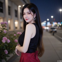 baoshi,lvjing,xiaomei,pifu,black hair,long hair,grey eyes,fair_skin,earrings,jewelry,1girl,serena \(pokemon\),long hair,solo,sleeveless,sleeveless shirt,smile,blonde hair,grey eyes,shirt,night,closed mouth,skirt,flower,outdoors,looking at viewer,red skirt,black shirt,eyelashes,looking back,low-tied long hair,upper body,blurry,breasts,high-waist skirt,building,city lights,5,