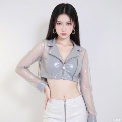 baoshi,lvjing,xiaomei,pifu,black hair,long hair,grey eyes,fair_skin,earrings,jewelry,1girl,solo,skirt,earrings,zipper,jewelry,see-through,navel,hand on own hip,crop top,looking at viewer,midriff,shiny clothes,zipper pull tab,long sleeves,white background,simple background,nail polish,white skirt,jacket,cowboy shot,miniskirt,closed mouth,breasts,lips,hoop earrings,latex,contrapposto,standing,9,cover,simple background,gradient background,close-up details,outstanding style,adding a touch of dimension to your images without compromising details,close-up,lvjing,baoshi,lvjing,