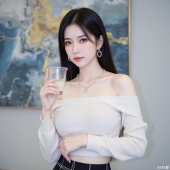 baoshi,lvjing,xiaomei,pifu,black hair,long hair,grey eyes,fair_skin,earrings,jewelry,1girl,solo,skirt,off shoulder,off-shoulder sweater,jewelry,white sweater,necklace,cup,bare shoulders,holding,sweater,disposable cup,breasts,black skirt,plaid skirt,collarbone,plaid,blurry background,crop top,holding cup,blurry,midriff,long sleeves,large breasts,63, cover,simple background,gradient background,close-up details,outstanding style,adding a touch of dimension to your images without compromising details,close-up