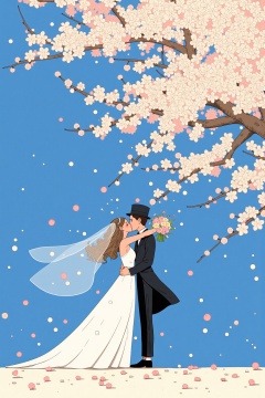 beijihui,An animated image of a bride and groom kissing under a cherry blossom tree. The bride is dressed in a white gown with a veil on her head. The groom is wearing a black tuxedo with a black hat on his head. He is holding a bouquet of flowers in his hands. The tree is a light brown color. The sky is a deep blue color. There are white and pink flowers scattered throughout the image.,