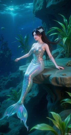 The mermaid is wearing a long, flowing mermaid tail that is covered in a rainbow-colored sequin pattern