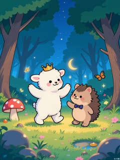 ZYF,A fluffy white lamb in a tiny crown dances with a hedgehog wearing a bow tie under a crescent moon. They twirl around a glowing mushroom stage, while fireflies form sparkling streamers. The forest background features weeping willow trees with lantern-lit leaves and a pond reflecting starry skies.