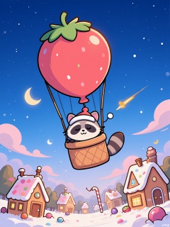 A sleepy raccoon in a nightcap floats in a hot air balloon shaped like a strawberry. Below, a candy-colored village with gingerbread houses and licorice roofs sleeps under a twilight sky. A shooting star leaves a trail of sprinkles.