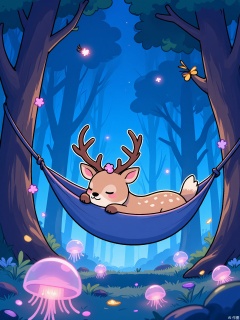 A deer with cherry blossom antlers naps in a hammock strung between two glowing jellyfish trees. The forest floor is carpeted with translucent jellyfish bells pulsating softly, while bioluminescent fireflies form a crown above its head.