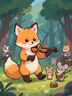 A fox cub plays a tiny violin made of twine and acorns on a mossy stage. The audience includes a badger conductor, rabbit cellists, and a family of mice tap-dancing on acorn drums.
