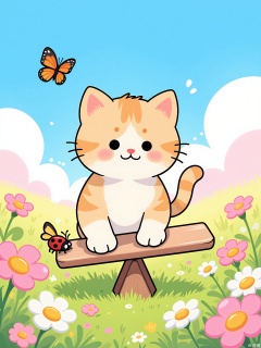A kitten with oversized paws balances on a rainbow-colored seesaw in a meadow of giant daisies. A ladybug perches on its tail, and butterflies with translucent wings flutter around cotton-candy clouds.