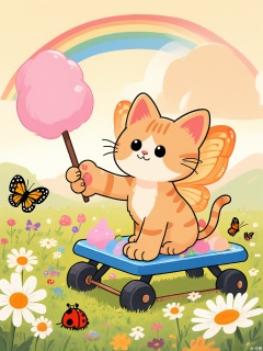 ZYF, A kitten with oversized paws balances on a rainbow-colored seesaw in a meadow of giant daisies. A ladybug perches on its tail, and butterflies with translucent wings flutter around cotton-candy clouds.