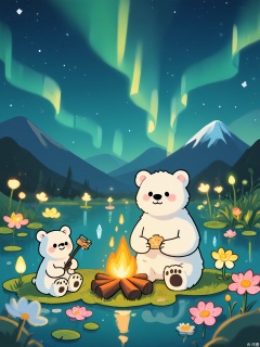 ZYF, A polar bear cub and a penguin share a blanket under a northern lights sky. They roast marshmallows on a stick over a campfire made of ice crystals, while aurora-green light reflects on a frozen lake dotted with glowing lily pads.