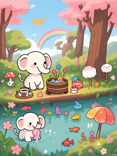ZYF, A tiny elephant with a rainbow trunk waters a garden of floating islands. Each island hosts a different ecosystem: one has cherry blossom trees with cotton-candy blooms, another holds a teacup pond with origami fish.