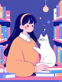 A librarian in a peach-colored sweater shelves books with a cat wearing tiny glasses. The library has staircases made of open books and chandeliers of glowing orbs.