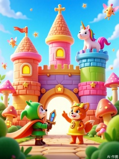 3d,This image displays a vibrant and whimsical cartoon scene. The main subject is a fairy tale castle built with colorful blocks. In front of the castle are two cartoon characters. One is a little hedgehog wearing a green knight's suit and an orange cape, holding a gem-encrusted sword. The other is a little fox dressed in a yellow dress and a bow headband, excitedly pointing at the castle gate. Around the castle, glowing mushrooms sway gently, and fairies carrying lanterns flutter about. At the top of the castle tower, a rainbow-colored unicorn is neighing happily. The gate is decorated with twinkling star patterns, and the entire scene exudes a dreamy and adventurous atmosphere.