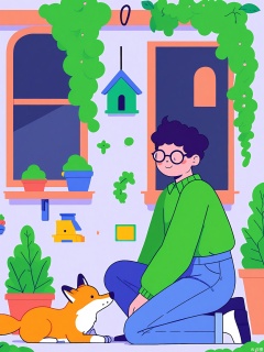 SLCH, A young man with curly auburn hair wearing a mint-green sweater and denim overalls kneels beside a fox cub wearing tiny glasses. They paint a wooden birdhouse together in a sunlit studio filled with clay pots and hanging ivy.