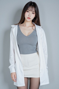 Sophisticated and alluring lady,This is a high-resolution photo of a young East Asian woman with a slim figure and fair skin. She stood in front of a plain light gray wall and posed,which enhanced people's attention to her. Her hair is smooth,with a long bob on her chin and blunt bangs that highlight her face and give her a smooth appearance. She wore a fitted ribbed gray top that highlighted her hourglass figure,especially her big tits. The top has a V-neck that reveals a hint of cleavage. In addition,she was wearing a white laboratory suit,slightly open,giving people a professional and casual feeling. She also wore a high-waisted white ribbed miniskirt,holding her hips tightly,highlighting her curvy buttocks. Her legs were wearing pure black pantyhose,adding a touch of sexiness. Her makeup is exquisite and focuses on natural beauty. Shooting at low angles,the overall composition and styling blends professional and tempting elements to create an interesting juxtaposition. The picture is clear and bright,accentuating the texture of her clothes and the smoothness of her skin. This photo may have been taken in a studio setting with minimal background,ensuring that the subject is always in focus.,