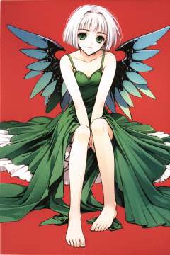 clover, 1girl, solo, barefoot, short hair, feet, soles, white hair, wings, dress, red background, bob cut, sitting, green eyes, <lora:clover:0.9>