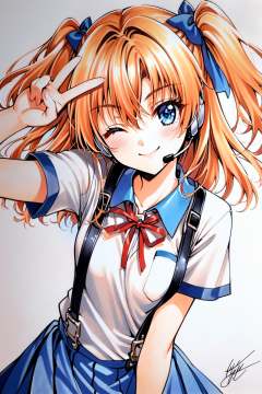 1girl,souryuu asuka langley,solo,long hair,school uniform,blue eyes,smile,white background,ribbon,shirt,simple background,v,one eye closed,orange hair,short sleeves,skirt,red ribbon,neck ribbon,white shirt,bangs,hair between eyes,looking at viewer,tokyo-3 middle school uniform,signature,closed mouth,two side up,hair ornament,suspender skirt,interface headset,suspenders,traditional media,cowboy shot,blue skirt,<lora:clover_XL:0.8>,