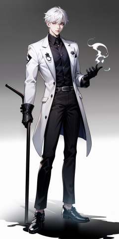 hezi,1boy,white hair,belt,full body,red eyes,simple background,sfw,white background,male focus,holding,coat,white coat,holding cane,white pants,white footwear,pants,long sleeves,long coat,gloves,standing,white shirt,shirt,black gloves,black footwear,white shirt,black belt,solo,black pants,cane,long hair,black shoes,original,long pants,holding cane,