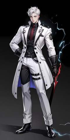 hezi,black footwear,1boy,white hair,white coat,belt,coat,sfw,black pants,long coat,weapon,electricity,black gloves,solo,full body,pants,holding,black belt,grey background,holding weapon,gloves,male focus,simple background,black footwear,electricity,white gloves,long hair,holding ***,***,original,black eyes,jacket,long sleeves,