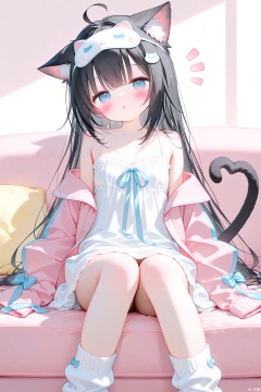 1girl, solo, long hair, looking at viewer, blush, bangs, blue eyes, black hair, hair ornament, long sleeves, dress, bow, animal ears, hair between eyes, bare shoulders, sitting, collarbone, jacket, tail, ahoge, heart, parted lips, food, open clothes, socks, puffy sleeves, virtual youtuber, cat ears, signature, off shoulder, white dress, :o, open jacket, cat tail, animal ear fluff, sleeves past wrists, pillow, mask, feet out of frame, white bow, cat girl, camisole, puffy long sleeves, sleeves past fingers, heart hair ornament, tail ornament, notice lines, controller, mask on head, pink jacket, loose socks, cat hair ornament, white camisole, striped socks, eye mask, heart tail, sleep mask