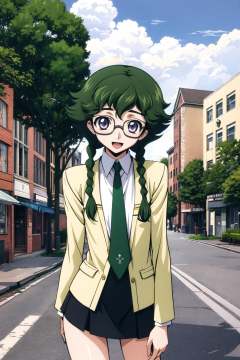 1girl, solo, happy, smile, open mouth, Nina_Einstein_S1, green hair, twin braids, bangs, short hair, purple eyes, blue eyes, glasses, rimless eyewear, BREAK ashford academy school uniform, yellow jacket, white shirt, collared shirt, long sleeves, green necktie, (black skirt:1.2), miniskirt, standing,outdoors, school, looking at viewer, pov, upper body, <lora:Takahiro Kimura:0.8>,<lora:Nina Einstein:0.5>