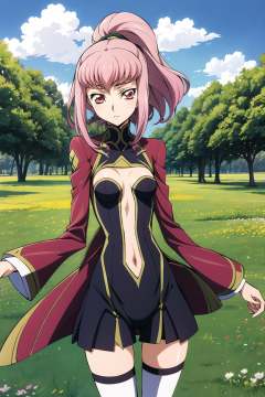 1girl, small breasts, Anya Alstreim, codeGeass, collared leotard, white leotard, long sleeves, navel cutout, thighs, pink thighhighs, pink hair, short ponytail, red eyes, (expressionless), standing, cowboy shot, solo, grasslands, forest, outdoors, <lora:Takahiro Kimura:0.8>,<lora:Anya Alstreim:0.5>