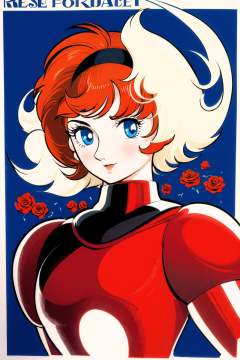 1girl, blue eyes, flower, rose, solo, orange hair, red flower, retro artstyle, copyright name, short hair, red rose, upper body, hairband, 1980s (style), armor, fire,<lora:Tezuka Osamu:0.8>