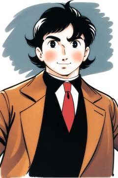 1boy, solo, male focus, necktie, black hair, white background, simple background, upper body, formal, smile, suit, looking at viewer, black eyes, striped necktie, retro artstyle, jacket, blush, striped, shirt, adjusting necktie,<lora:Tezuka Osamu:0.8>