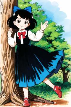 1girl, dress, black hair, white dress, skirt hold, nature, long sleeves, short hair, puffy sleeves, bow, smile, tree, painting (medium), traditional media, hair bow,<lora:Tezuka Osamu:0.8>