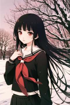 Enma Ai, 1girl, solo, school uniform, long hair, black hair, snow, serafuku, snowing, black serafuku, hime cut, scarecrow, <lora:Enma Ai:0.8>