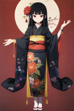 Enma Ai, 1girl, solo, long hair, japanese clothes, black hair, flower, bangs, kimono, floral print, spider, blunt bangs, tabi, jewelry, red eyes, hime cut, sash, black kimono, socks, bracelet, looking at viewer, full body, red flower, <lora:Enma Ai:0.8>