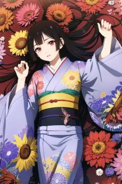 Enma Ai, 1girl, chrysanthemum, flower, solo, japanese clothes, long hair, kimono, yellow flower, butterfly, hair spread out, purple flower, sash, floral print, black hair, bug, red eyes, lying, obi, orange flower, bangs, on back, kikumon, spider lily, pink flower, colorful, red flower, blunt bangs, blue flower, looking at viewer, parted lips, butterfly print, print kimono, long sleeves, crane \(animal\), pale skin, wide sleeves, from above, <lora:Enma Ai:0.8>