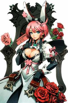 cowboy shot, 1girl, xrd, elpheltms, four-leaf clover, dress, animal ears,gloves, hairband, cleavage cutout, rabbit ears, simple background,  <lora:Daisuke Ishiwatari:0.7>, <lora:Elphelt Valentine:0.8>