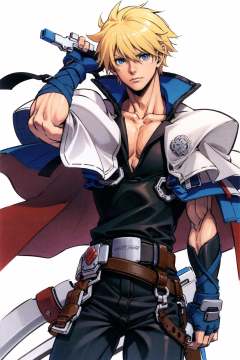 cowboy shot, solo, male focus, 1boy, ggskykiske, weapon, blonde hair, sword, blue eyes, gloves, fingerless gloves, ponytail, long hair, capelet, belt, simple background,   <lora:Daisuke Ishiwatari:0.7>, <lora:Ky Kiske:0.8>