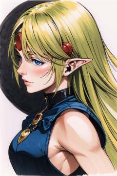 1girl, solo, pointy ears, blonde hair, elf, long hair, blue eyes, traditional media, signature, profile, white background, sleeveless, circlet, simple background, upper body, fingernails,   <lora:Daisuke Ishiwatari:0.8>